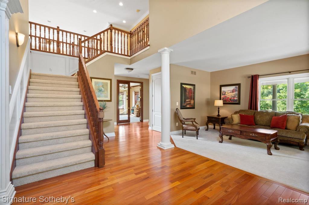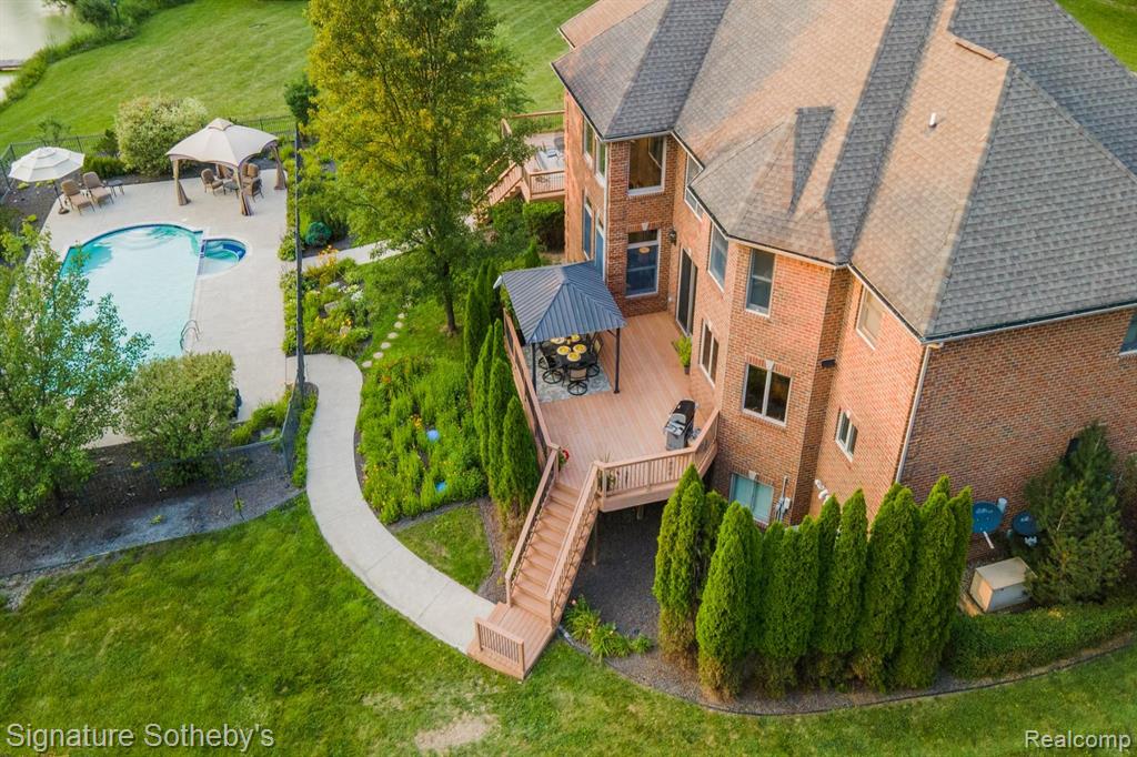 Custom-built brick and stone estate offering approximately 6,800 square feet of refined living space, including a beautifully finished lower level, all set on 11 private acres. This light-filled home showcases exceptional craftsmanship, high-end finishes, and a thoughtfully designed floor plan ideal for both everyday living and elegant entertaining. The main level features a grand great room with gas fireplace, a gourmet kitchen with oversized granite island and beverage bar, formal living and dining rooms, a private office (or optional sixth bedroom), four-season sunroom, and full amenities including laundry and baths. Upstairs, the luxurious primary suite offers a massive walk-in closet and private bonus room, complemented by a princess suite and additional bedrooms with a Jack-and-Jill bath and abundant storage. The finished lower level impresses with a large family and game room, spectacular wet bar, fifth bedroom, full bath, and ample storage. Outdoors, the property transforms into a private resort featuring an in-ground pool with spa bubbler, expansive patio, wraparound porch, and pergola-covered deck—all surrounded by mature landscaping, seasonal gardens, a private pond, and scenic trails. A 40x60 all-brick outbuilding with loft and RV bay provides exceptional versatility for cars, hobbies, or storage. Located in Cobblestone Farms with access to two miles of private walking trails, this estate offers rare privacy, space, and sophistication—truly a complete luxury retreat. |